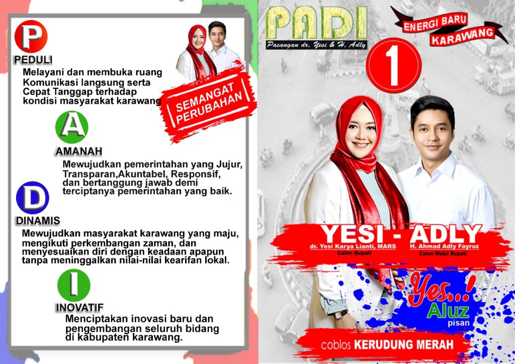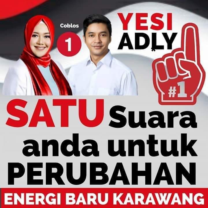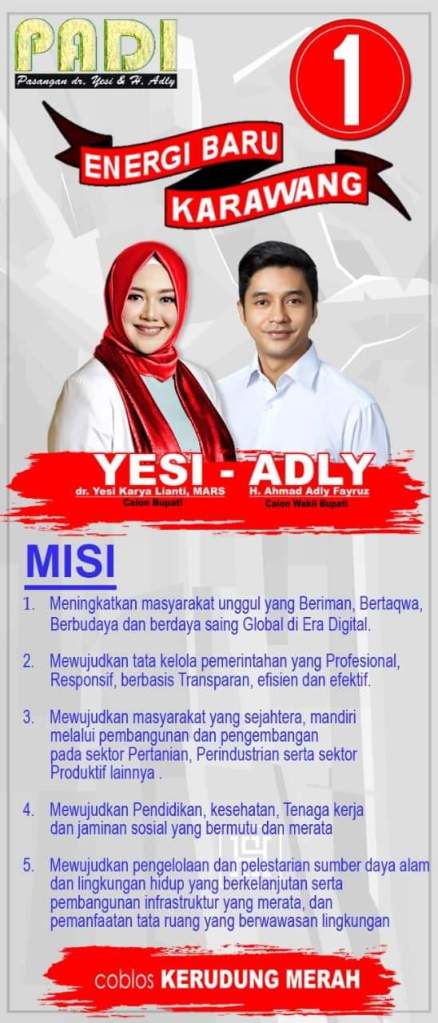 Dengan Mengusung Nomor Urut 1 yang Memiliki Visi PADI Peduli, Amanah, Dinamis dan Inovatif. Pasangan YESI-ADLY Saat ini Menggaung Seantero Karawang Menguasai Seluruh daerah yang ada di Kabupaten Karawang. Terus Menggema Menyuarakan SATUKAN KARAWANG.