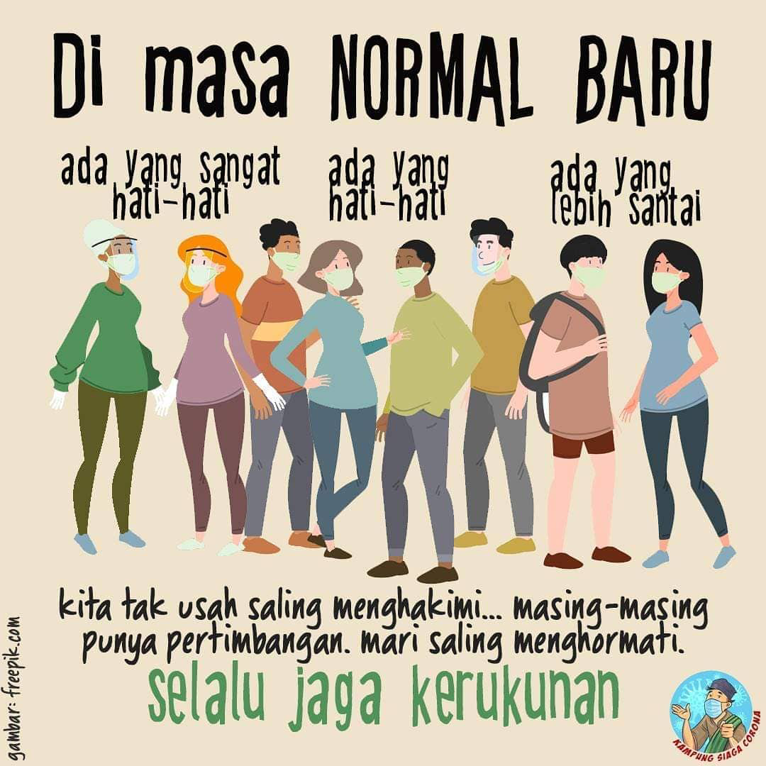 Pada masa pandemi masyarakat Indonesia diharuskan hidup dengan tatanan hidup baru yang dapat ‘berdamai’ dengan Covid-19. Adapun yang dimaksud dengan new normal adalah suatu tindakan atau perilaku yang dilakukan oleh masyarakat dan semua institusi yang ada diwilayah tersebut untuk melakukan pola harian atau pola kerja atau pola hidup baru yang berbeda dengan sebelumnya. Bila hal ini tidak dilakukan akan terjadi risiko penularan.